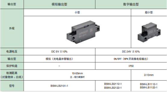 歐姆龍限定反射傳感器B5W-LB系列檢測(cè)范圍廣,因此耐物體位置偏移強(qiáng),不易受外部干擾影響的設(shè)計(jì)。備有模擬電壓輸出和數(shù)字輸出兩種輸出模式。