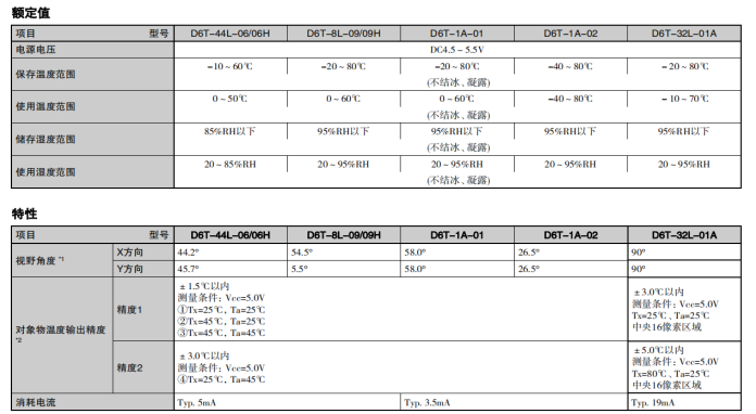MEMS非接觸式溫度傳感器的額定值/特性: