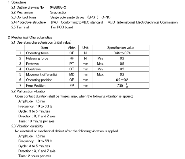 D2FC-F-7N(10M), 克力為:60+/-15G,壽命為1000萬次;
