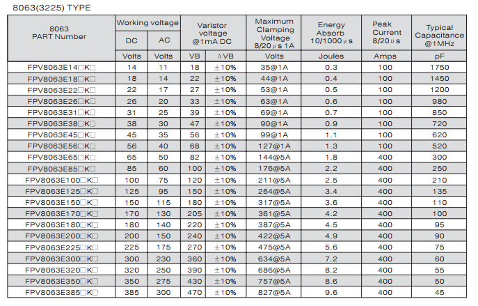 特征: 1、疊層片式陶瓷結(jié)構(gòu)。 2、無引線。 3、溫度范圍:-55℃~+125 ℃。 4、工作電壓范圍V w(dc)=3.3~ 615V。 5、具有雙向限制特性,適合ESD保護(hù)。 6、漏電流非常小。 7、寄生電感小、響應(yīng)速度快(響應(yīng)時(shí)間少于0.5ns)。 8、優(yōu)良的溫度系數(shù)。 9、良好的焊接性能(端電極為三層電鍍)。 應(yīng)用: 1、防止過電壓:當(dāng)施加的電壓升高到壓敏電壓時(shí),壓敏電阻器的電流急劇上升,被保護(hù)設(shè)備的浪涌電壓迅速減小,從而使裝有壓敏電阻器的設(shè)備抗浪涌噪聲能力達(dá)到相應(yīng)要求。